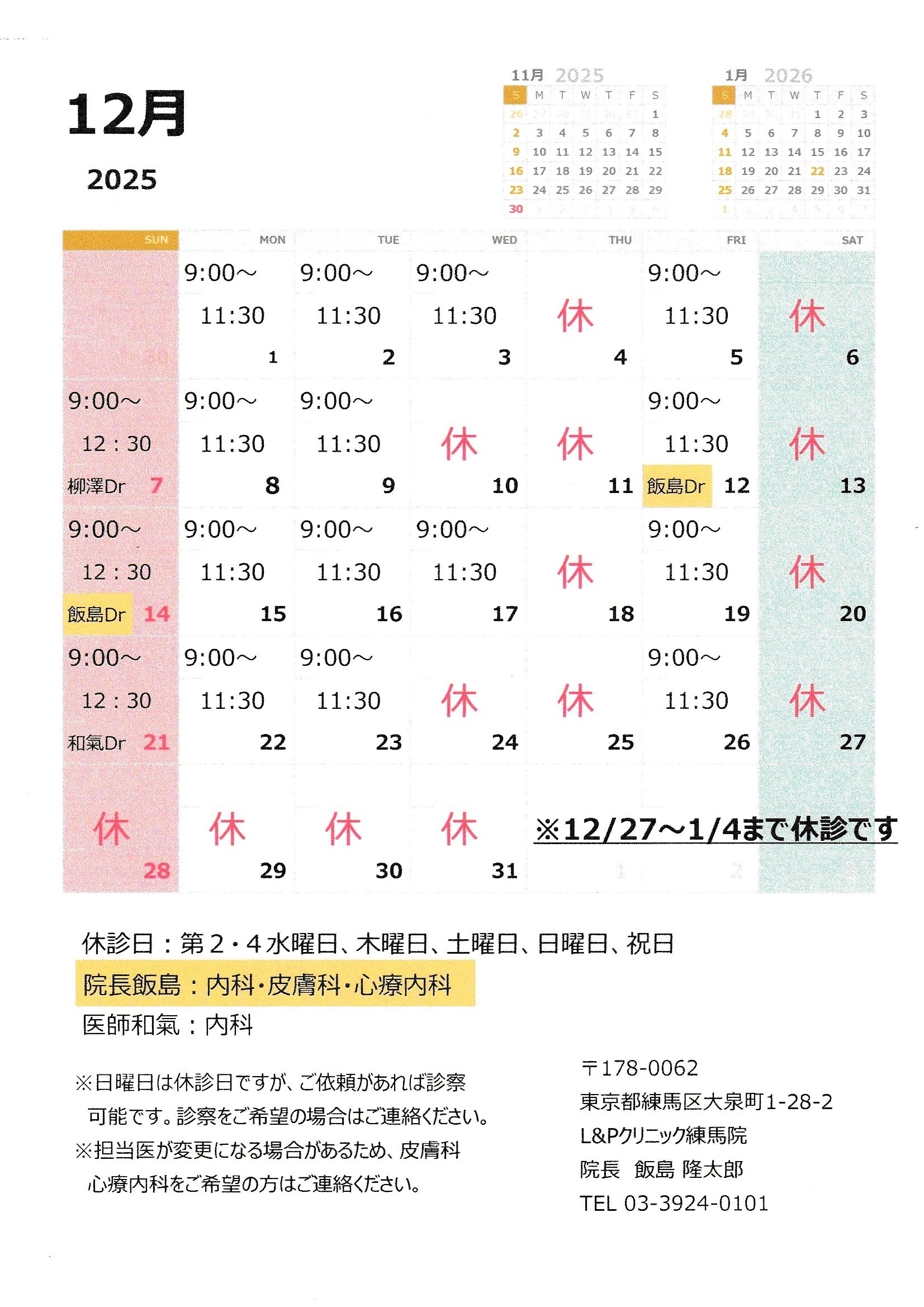 2025.11.18 12月の診療日カレンダー 12/7(日)は内科のみの診療となるため、皮膚科・心療内科の診察は行っておりません。 また、12/7から1/4までは休診となります。 ご迷惑をお掛けいたしますが、ご理解のほどよろしくお願い申し上げます。 次のページへ 一覧へ戻る